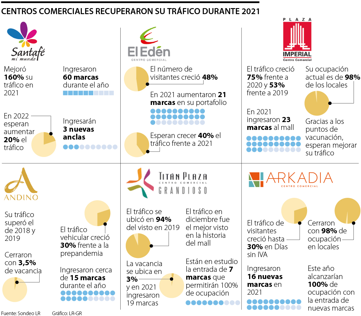 Andino tuvo una disponibilidad de 3,5% a cierre de 2021 y Titán Plaza de 3%. Los buenos datos se explican por el ingreso de marcas. Estos seis malls tuvieron más de 135 entradas a lo largo del año. Fue liderada por Santafé con 60 marcas y este año tendrán tres nuevas anclas. Esto llevará a que este año tenga mejoras entre 20% y 40% en tráfico.