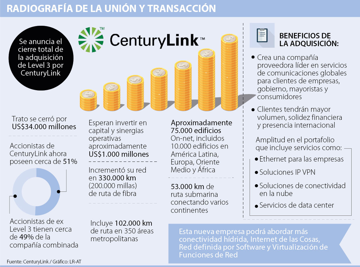 Por un valor de US$34.000 millones finalmente el trato fue sellado y dio paso a que la nueva CenturyLink pueda conectar más de 350 áreas metropolitanas con aproximadamente 100.000 edificios on-net que están habilitados para fibra de los cuales 10.000 están en América Latina, Europa, Oriente Medio y África.