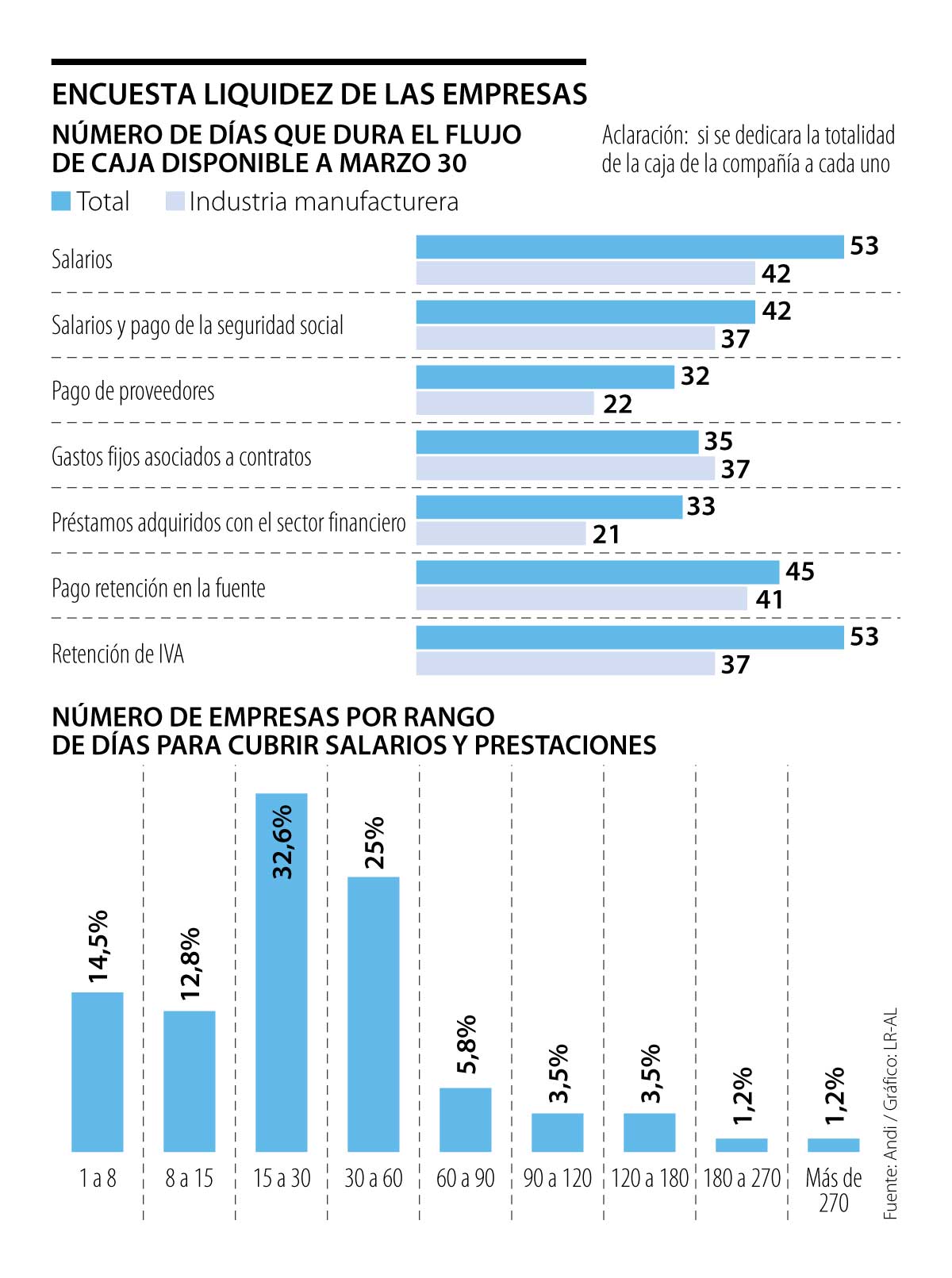 Para conocer la situación de las empresas en su flujo de caja, la Andi empezó a realizar la Encuesta de Liquidez, que en su primera edición arrojó que 59,9% de las sociedades encuestadas (172) tienen flujo de caja de un mes o menos para pagar la nómina y la seguridad social de sus colaboradores.