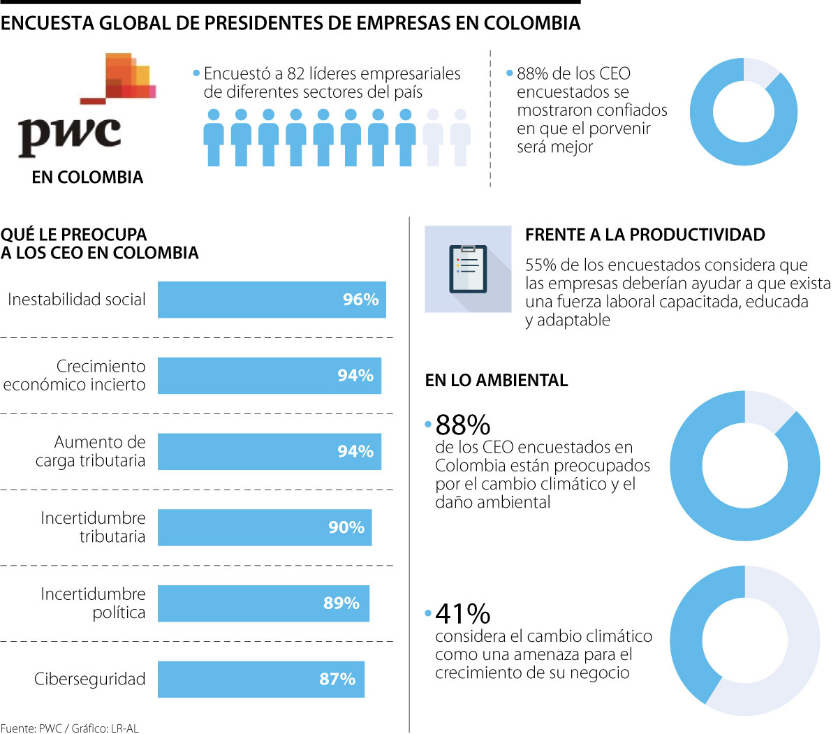 La firma de consultoría PWC presentó su encuesta a presidentes de empresas en Colombia, la cual señaló que su principal preocupación es la inestabilidad social