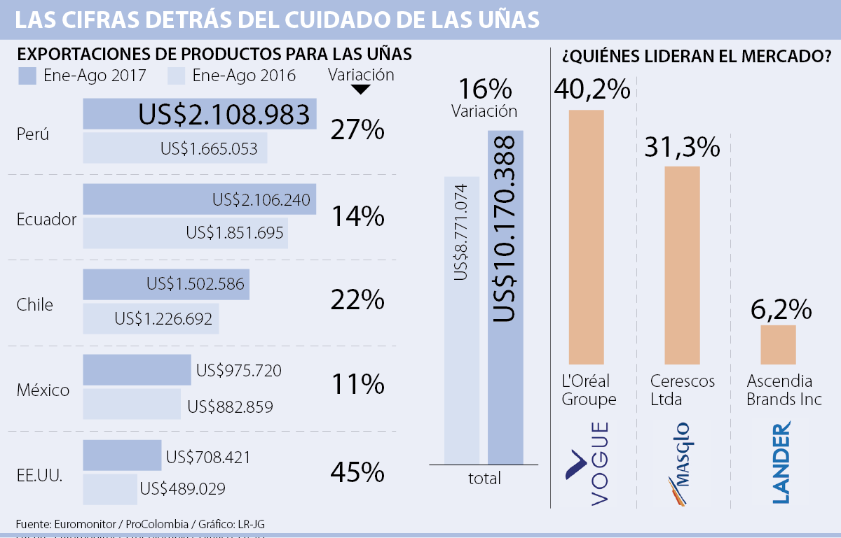 Cifras de ProColombia revelaron que entre enero y agosto de 2017, el país exportó US$10,1 millones en productos para uñas, exceptuando medicamentos. La suma fue 16% superior a la que se reportó en este mismo periodo de 2016, cuando se comercializaron US$8,7 millones.