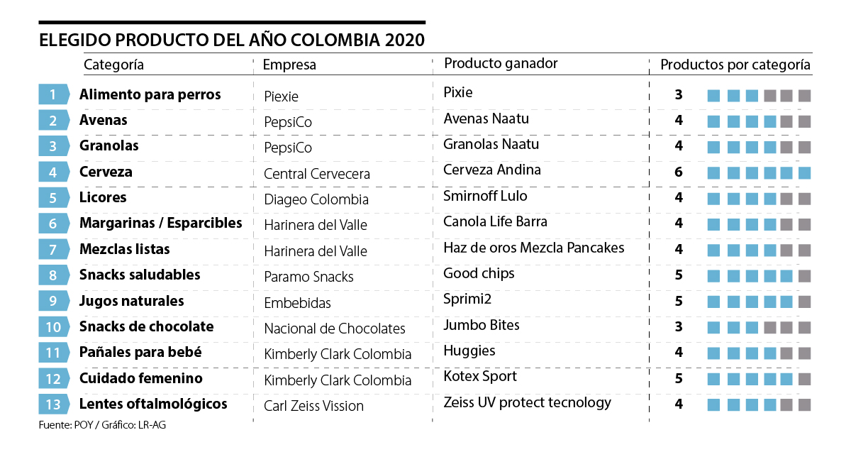 Entre las compañías ganadoras del reconocimiento están Piexie, PepsiCo, Central Cervecera, Diageo Colombia, Harinera del Valle, Paramo Snacks, Embebidas, Nacional de Chocolates y Kimberly Clark, entre otras, que participaron en 13 categorías, seis de estas relacionadas con alimentos; tres de cuidado personal; dos de bebidas alcohólicas; una de bebidas sin alcohol y una de alimentos para perros.