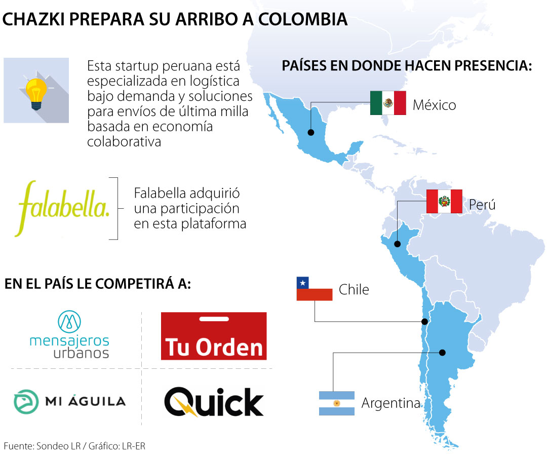 El Diario Gestión de Perú dio a conocer que la startup que trabaja en el negocio de entrega de última milla, Chazki, que hoy tiene presencia en México, Chile y Argentina, se prepara para llegar al país de la mano de Falabella en julio.