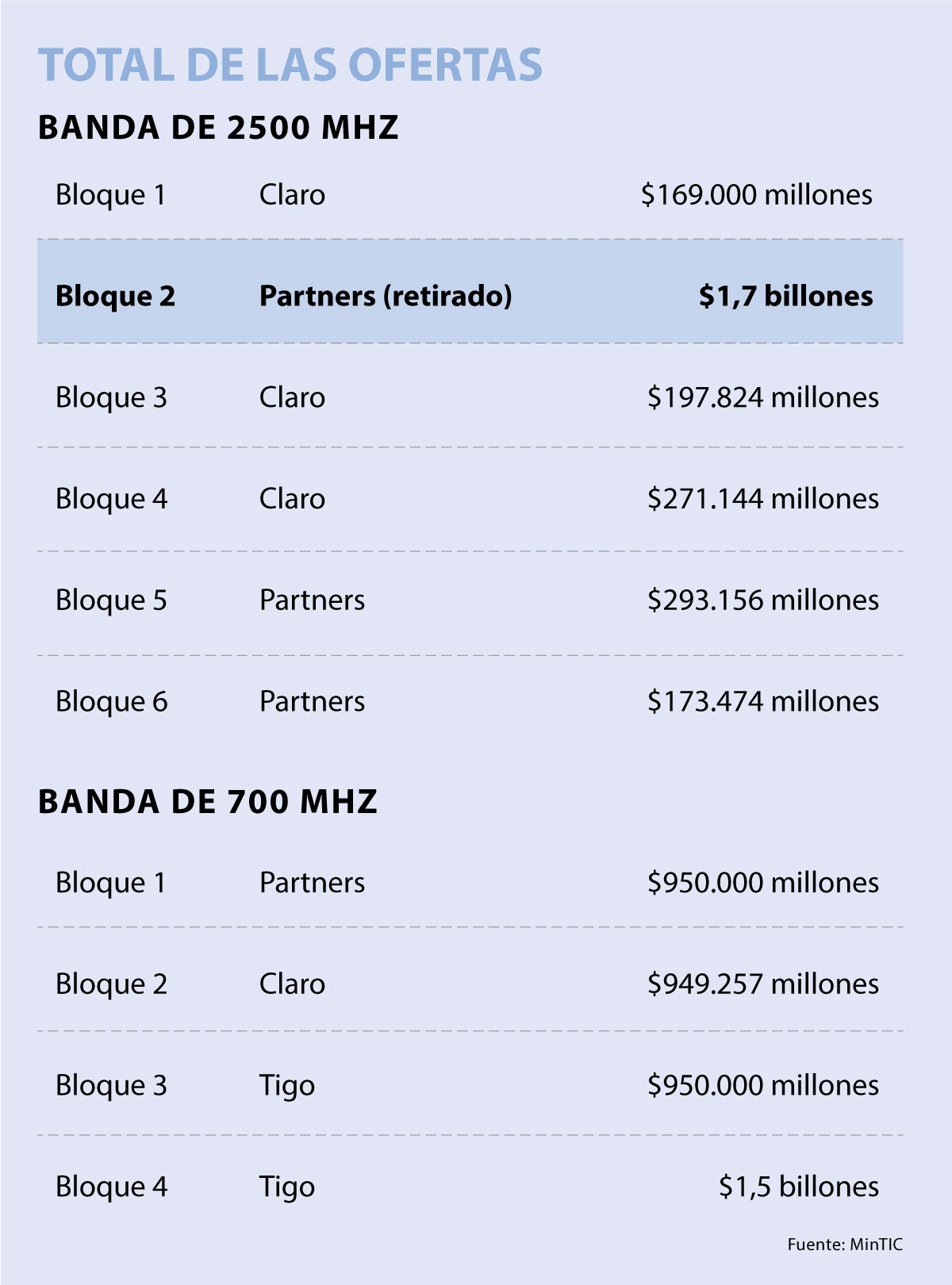 Así las cosas, teniendo en cuenta que WOM en una de sus pujas había ofertado $1,7 billones, el total de lo que esperaría recibir el Gobierno por la subasta (si se suma el resto de ofertas de Claro y Tigo en las bandas de 700 MHz y 2.500 MHz era un total de $7,2 billones. Ahora, WOM que retiró su oferta por el bloque 2 de la banda de 2.500 MHz, lo que recibiría el Estado serían $5,4 billones.