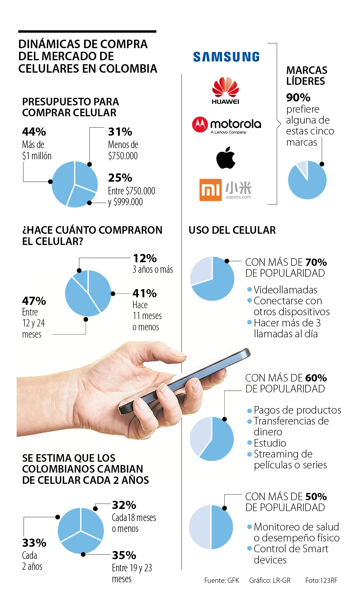 Samsung, Huawei , Motorola, Apple y Xiaomi son las cinco marcas preferidas por los colombianos, pues 90% aseguró que son sus principales referencias cuando piensan en cambiar de celular.