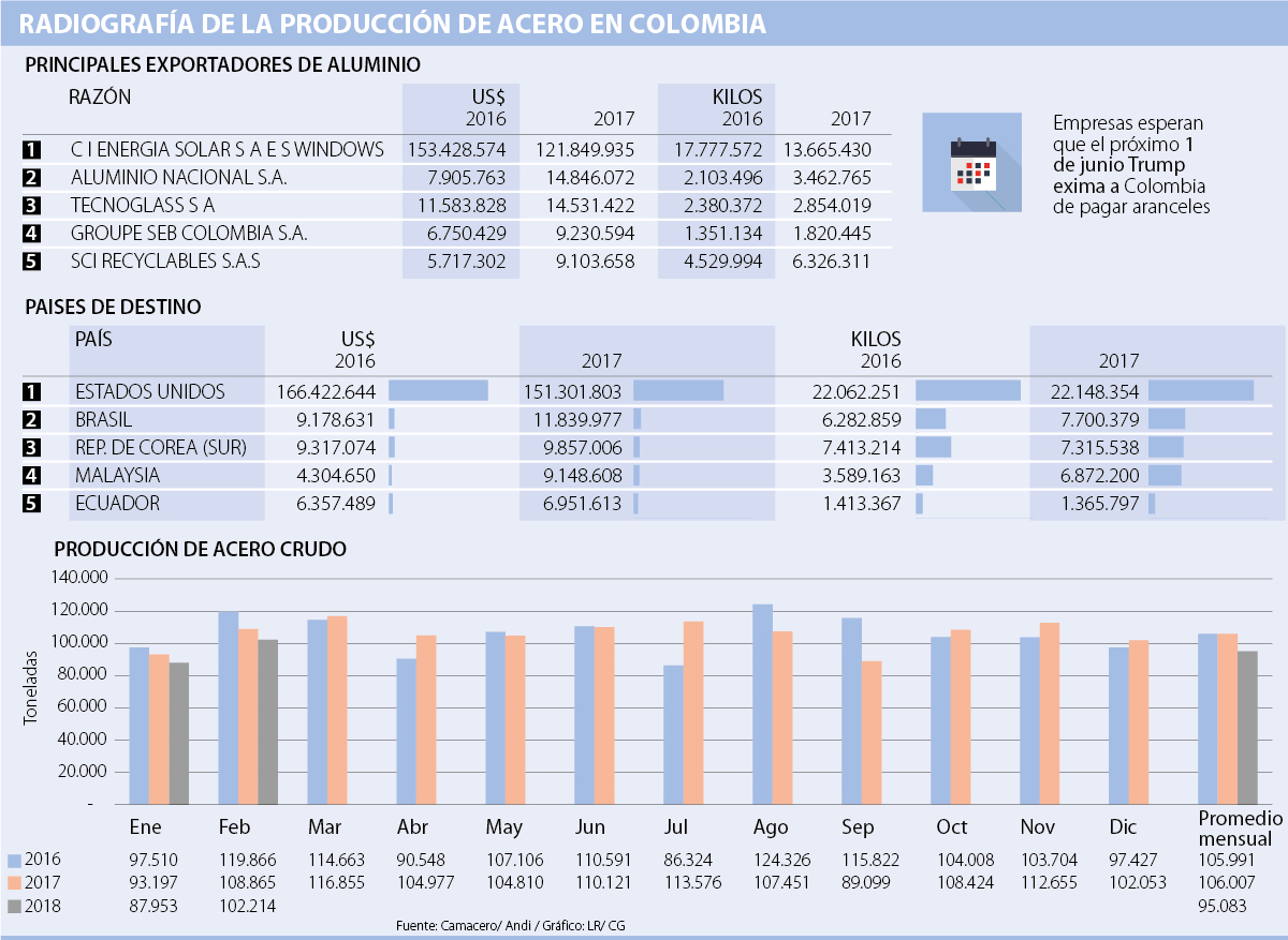 El tratado de libre comercio con Estados Unidos, el alto volumen de exportaciones colombianas hacia ese país y las numerosas medidas antidumping de Colombia, son tres de las cinco principales razones por las cuales los empresarios del sector siderúrgico le piden al gobierno de Trump que se levante el pago de aranceles para la importación de acero y aluminio.