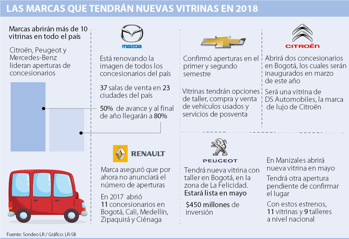 La lista de objetivos, inversiones y lanzamientos que se darán este año en el sector automotor ya tiene una hoja de ruta. El acuerdo con Mercosur, sumado al Salón del Automóvil 2018 y la estabilización en la tasa de cambio abren grandes oportunidades para el sector, tanto así, que a tan solo 33 días de iniciar el año las marcas ya preparan la inauguración de un poco más de 10 concesionarios. Citroën, Peugeot y Mercedes Benz lideran las aperturas en las principales ciudades el país.