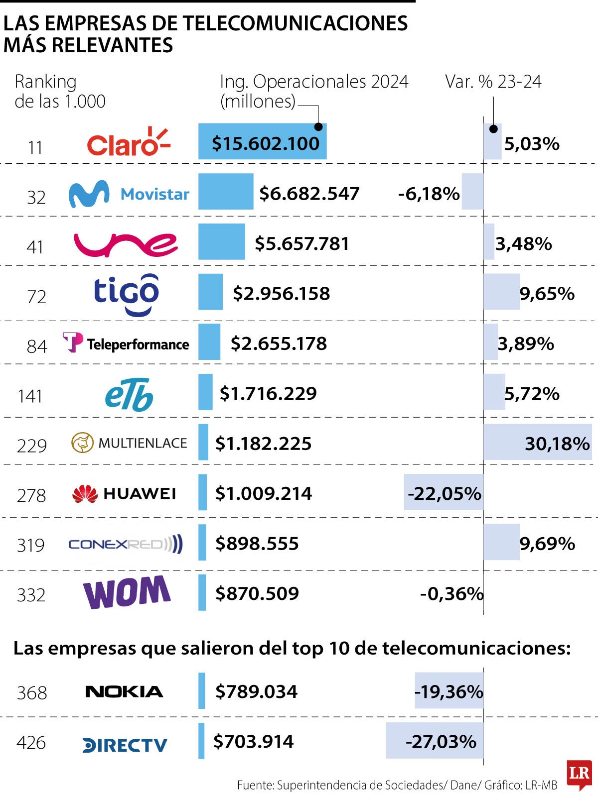 Dentro del ranking del top 10 de las compañías de telecomunicaciones, hubo dos salidas. DirecTV y Nokia Solutions and Networks Colombia fueron las empresas que no lograron mantenerse en la lista.