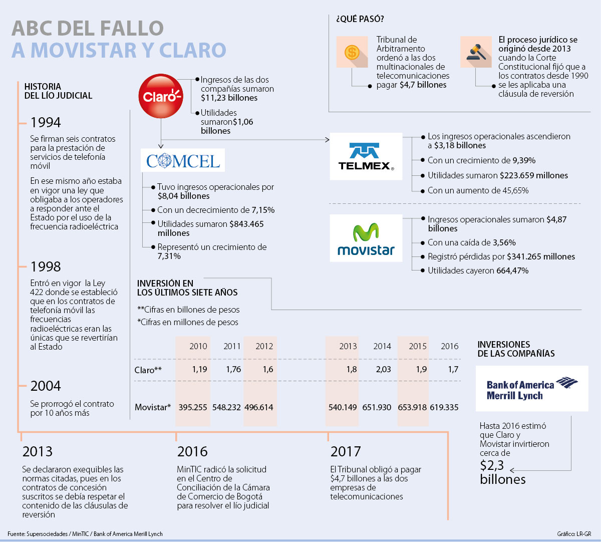 Una demanda interpuesta por el Ministerio de las Tecnologías de la Información y las Comunicaciones (MinTIC), y aprobada por el Tribunal de Arbitramento, fue la causante de que las multinacionales Comunicación Celular S.A. Comcel S.A y Colombia Telecomunicaciones S.A., es decir, Claro y Movistar, deban pagar $4,7 billones, cifra que representa una tercera parte de los ingresos de las compañías en 2016 ($16,1 billones).