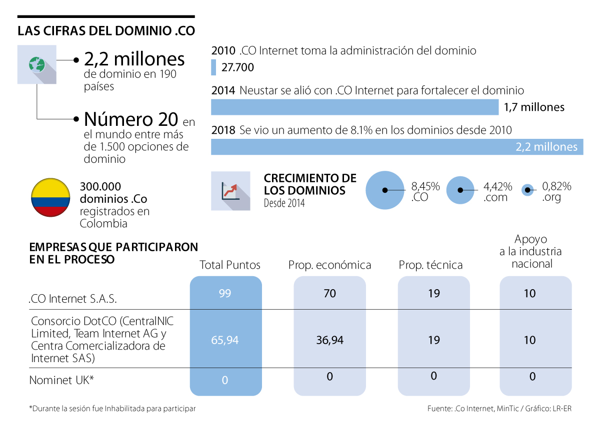 La audiencia de adjudicación de la licitación en la que se escogería al contratista encargado de operar el registro del dominio .co por los próximos cinco años dio como ganador a .Co Internet S.A.S, empresa que ha estado administrando el dominio en la última década, tiempo en el cuál se superaron los 2,2 millones de dominios en 190 países.