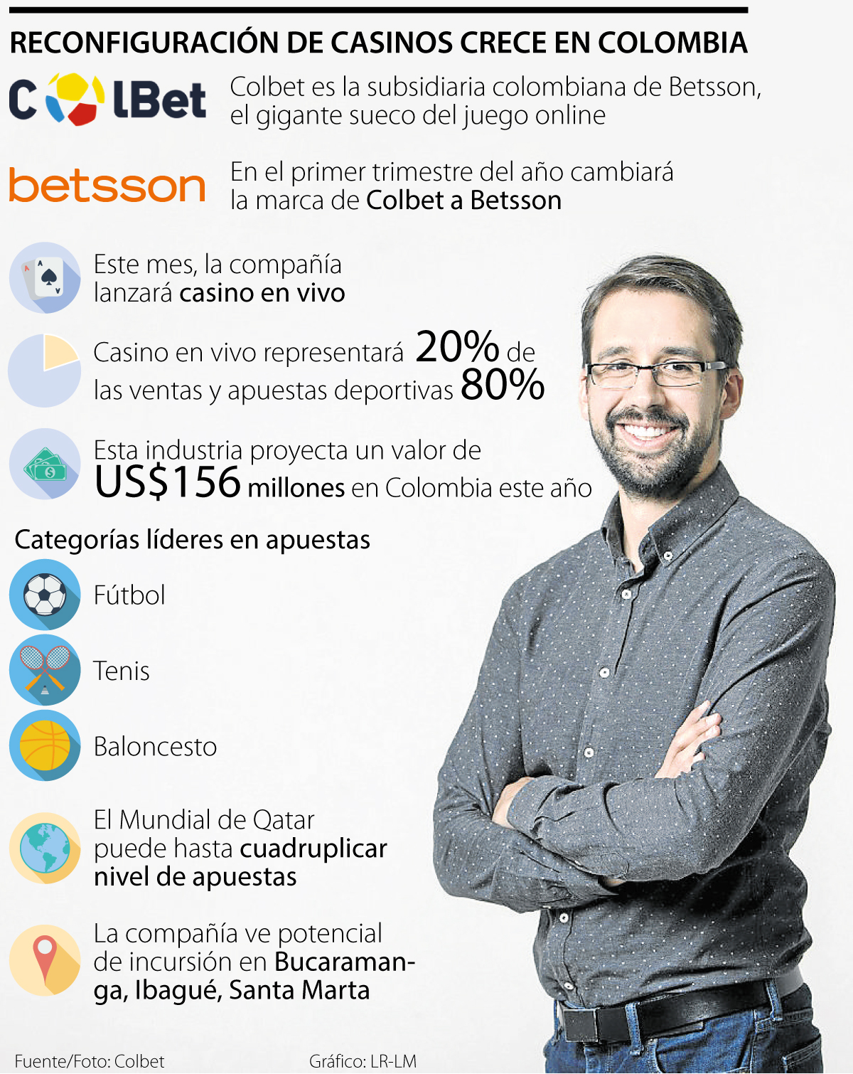 “De acuerdo con las cifras de Coljuegos, los casinos están creciendo a niveles superiores de 100%, por eso es muy importante para nosotros entrar a competir en el mercado. Por otra parte, el año pasado fue de transición, reclutamos un nuevo equipo comercial, cambiamos de plataforma y tenemos un último paso para renovarnos completamente, el cual consiste en que, para este primer trimestre de este año, cambiaremos el nombre de Colbet a Betsson, para que se integre a la estructura internacional de esta compañía”, explicó Melo.
