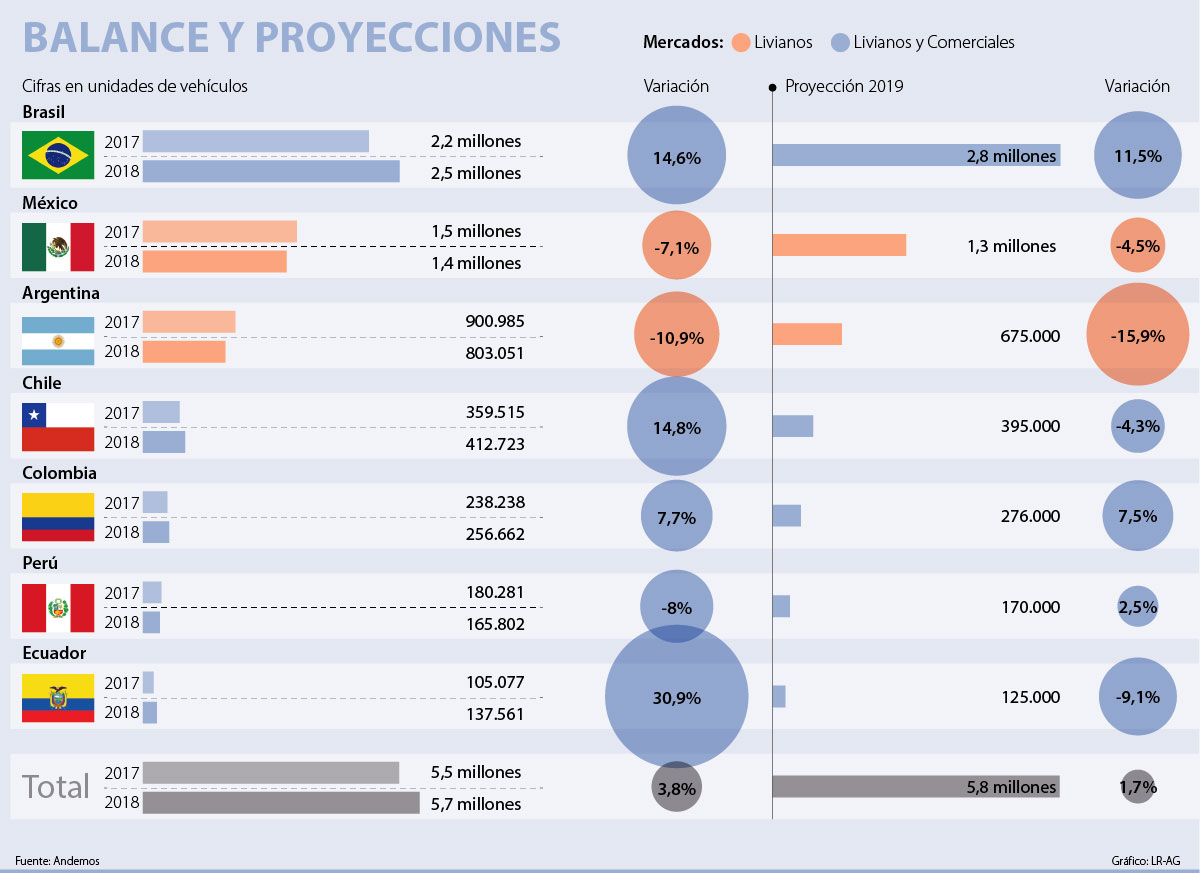 El top 3 de países que sí mostrarían dígitos positivos durante este año lo completa Perú, que según los cálculos de la asociación tendría un crecimiento de 2,5%, gracias a la venta de 170.000 unidades. A diferencia de Brasil y Colombia, el sector automotor peruano sí tendría un balance de cierre mejor al del año pasado, teniendo en cuenta que entre 2017 y 2018 registró -8% en este ítem.