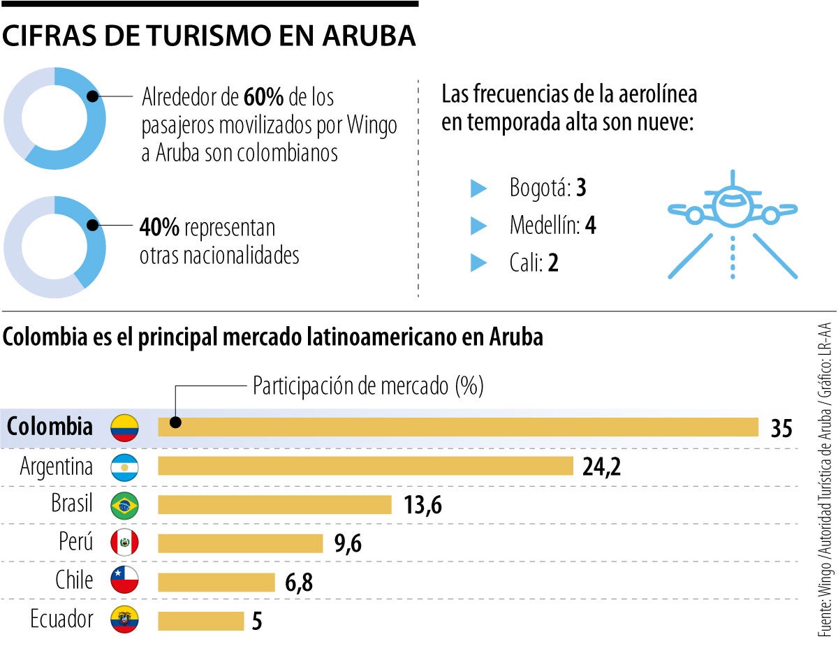 Aruba depende 98% del turismo. Su economía se sustenta en el movimiento financiero de hoteles, restaurantes y aerolíneas. A la isla llegan alrededor de cinco empresas de aviación. Wingo es una de ellas y sus datos arrojan que hasta 60% de sus viajes desde y hacia Aruba son de colombianos.