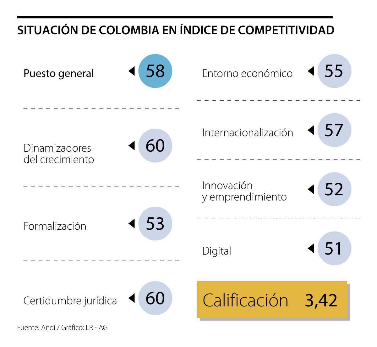 En el panorama general a Colombia no le va muy bien, ya que entre 63 naciones analizadas, el país ocupa el puesto 58; muy cerca del fondo del listado, puesto con el que se queda Venezuela.