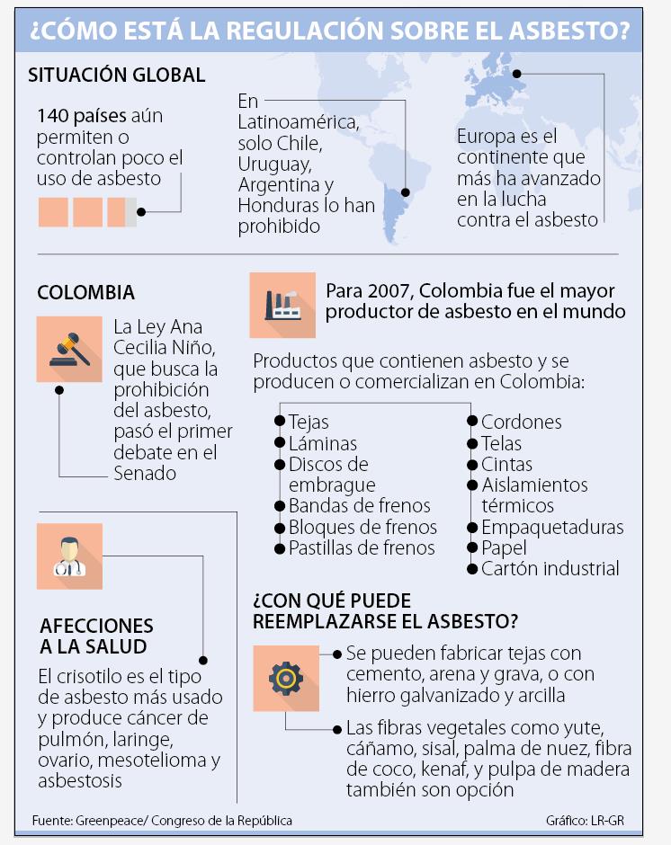 El proyecto de ley Ana Cecilia Niño, que busca la prohibición del asbesto, superó su primera prueba en el Congreso el pasado miércoles, cuando fue avalado en primer debate. De llegar a aprobarse esta reglamentación, Colombia se convertiría en el quinto país de la región en prohibir el uso de este mineral, luego de Argentina, Chile, Uruguay y Honduras.
