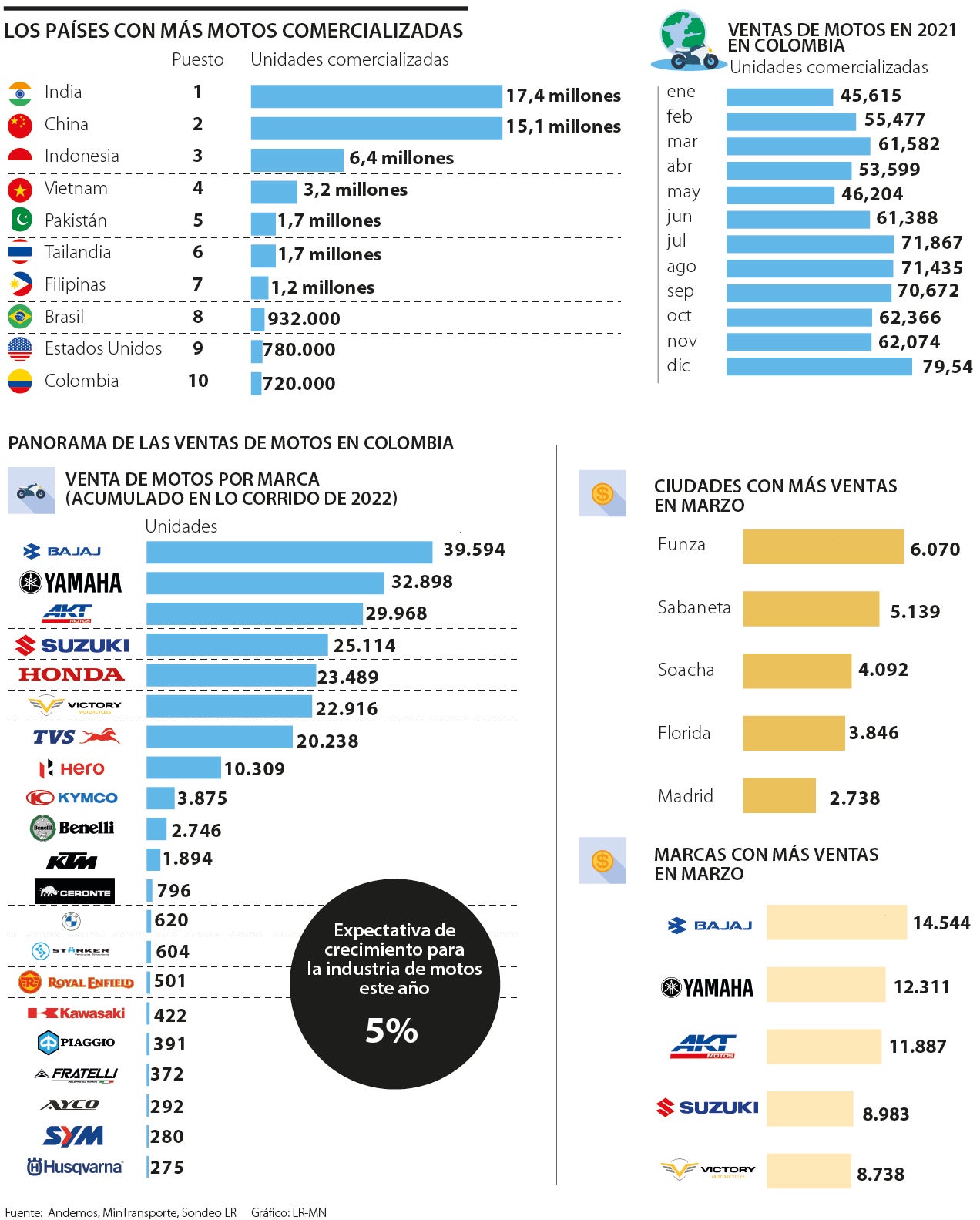 En Latinoamérica, por encima de Colombia solo estaría Brasil, país donde el volumen de motocicletas transadas alcanza las 930.000 unidades. Desde el punto de vista global, el mercado sigue siendo liderado por naciones asiáticas como India y China, con más de 30 millones de motos entre las dos. Le siguen en el listado Indonesia, Vietnam, Pakistán y Tailandia.
