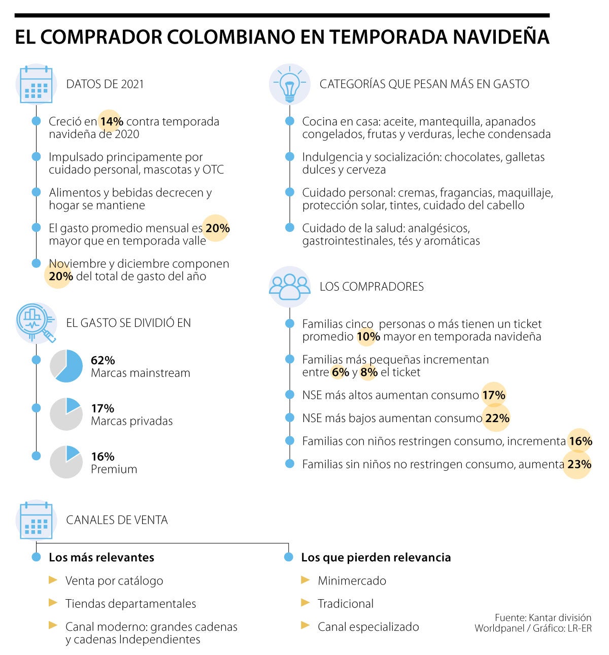 Y es que en 2021, el gasto durante la temporada de navidad creció en 14% contra 2020. Además, el gasto promedio mensual de los compradores en la canasta es 20% mayor durante esta época que en la temporada valle; un dato curioso es que durante noviembre y diciembre el comprador colombiano hace 20% de su gasto total de todo el año. Además, durante los demás meses del año el consumo no creció, de acuerdo con los datos reportados en el informe de Kantar.