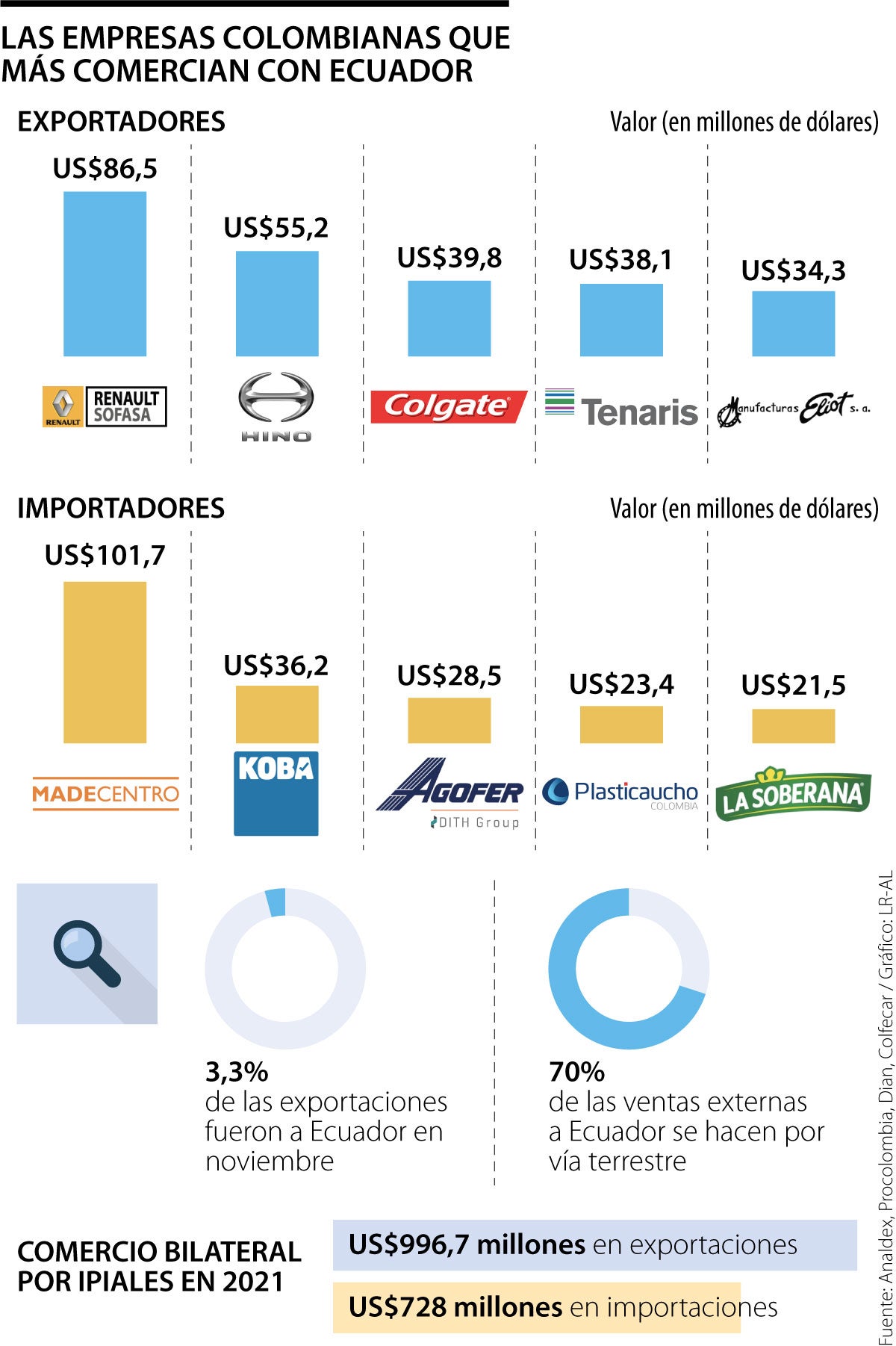 Las compañías con un mayor volumen de exportaciones a Ecuador pertenecen al sector automotor. En 2022, Renault Sofasa y Hino Colombia registraron US$86,5 millones y US$55,2 millones respectivamente. Le siguen Colgate con US$39,80 millones y la fabricante de tubos Tenaris con US$38,10 millones. Para el caso de los importadores, el principal actor es Madecentro con un valor de alrededor de US$101,70 millones. Le siguen el retailer D1, con más de US$36,2 millones y Agofer, que registró US$28,50 millones el año pasado.