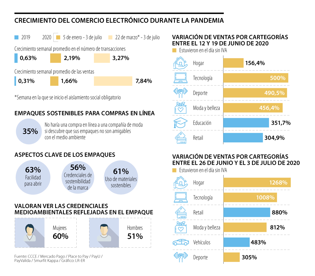Sin duda el comercio electrónico ha sido el mayor beneficiado con las medidas de aislamiento de la pandemia, pues las personas han conocido y confiando en este medio para suplir sus necesidades sin salir de casa. Su efectividad ha sido tal, que desde el inicio de la cuarentena hasta el 3 de julio, el comercio electrónico ha tenido un crecimiento semanal de 7,84%, según cifras de la Cámara Colombiana del Comercio Electrónico, Ccce.