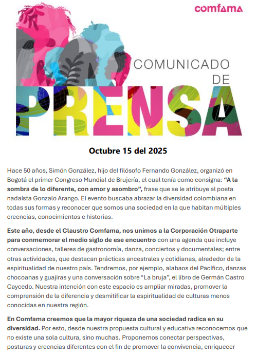 La caja de compensación explicó también los motivos históricos detrás del congreso. "Hace 50 años, Simón González, hijo del filósofo Fernando González, organizó en Bogotá el primer Congreso Mundial de Brujería, el cual tenía como consigna: 'A la sombra de lo diferente, con amor y asombro', frase que se le atribuye al poeta nadaísta Gonzalo Arango. El evento buscaba abrazar la diversidad colombiana", argumentó la entidad.