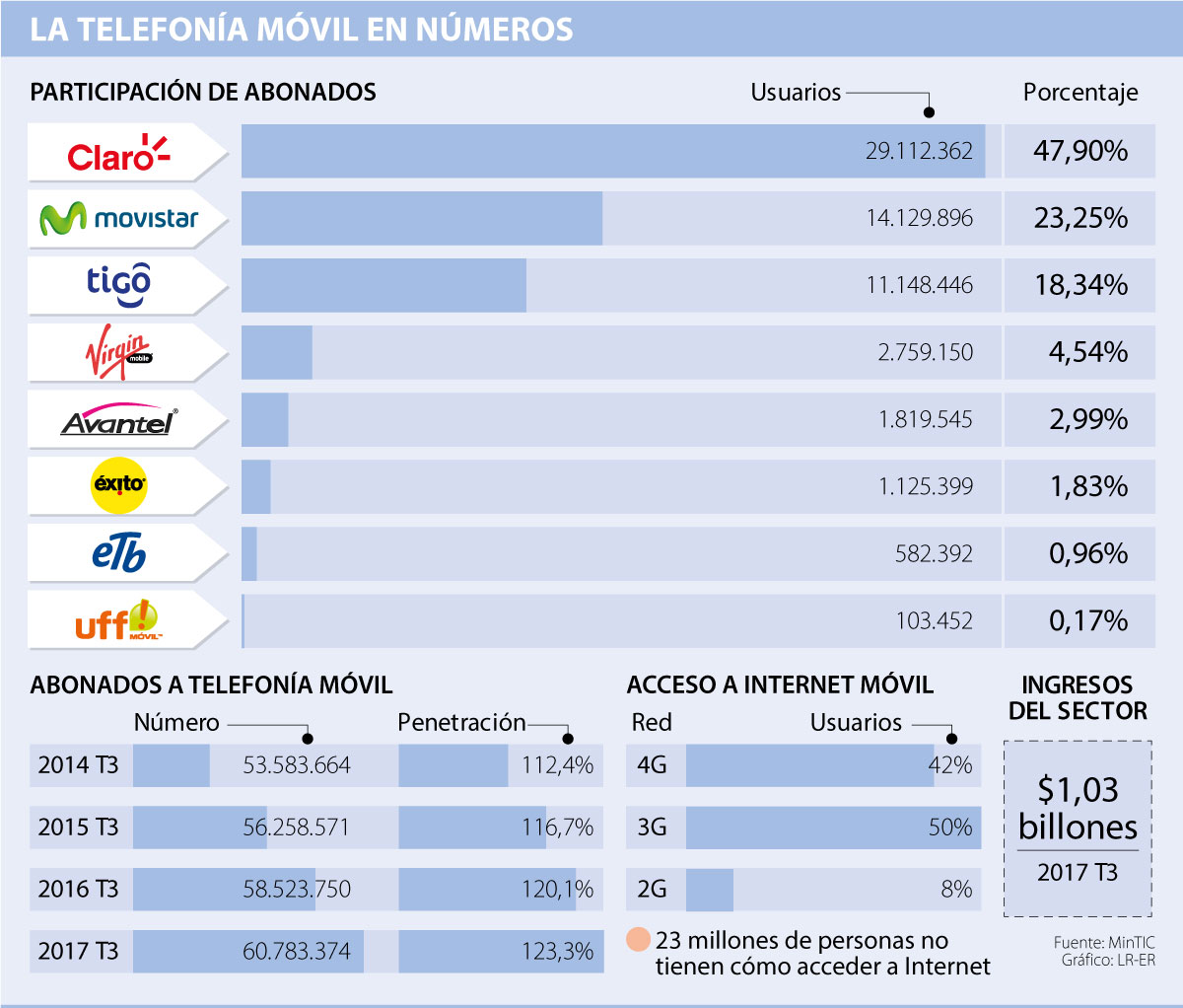 De acuerdo con cifras del Ministerio de Tecnologías de la Información y Telecomunicaciones, las empresas Claro, Movistar y Tigo, pertenecientes a Asomóvil, abarcan 89,49% del total de usuarios de telefonía móvil, sector que para el tercer trimestre de 2017, última medición oficial, contaba con una penetración en el mercado de 123,3%, con un total de más de 60,78 millones de abonados. En el resto del mercado, Virgin Mobile cuenta con una participación de 4,54%; y Avantel, con 2,99%.