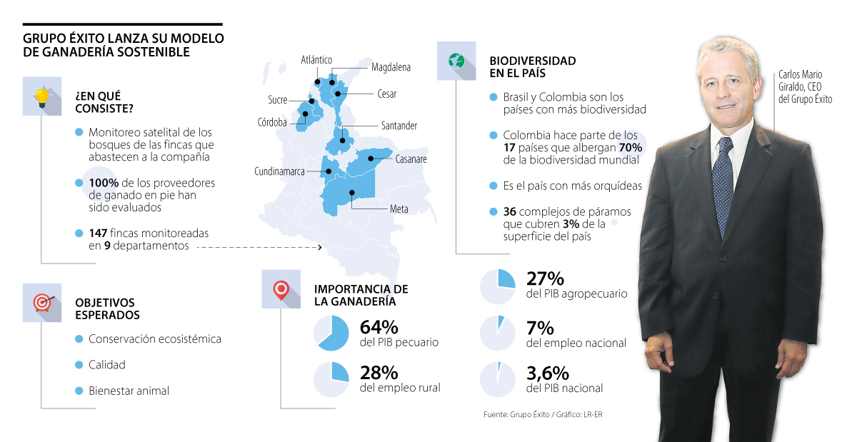 Grupo Éxito presentó ayer su modelo de ganadería sostenible, con el que busca mejorar la conservación de los ecosistemas, la calidad cárnica, y el bienestar animal. Por esta razón, realizó un monitoreo satelital de los predios de sus proveedores para verificar que cumplieran los límites de la frontera agrícola y la cobertura boscosa.