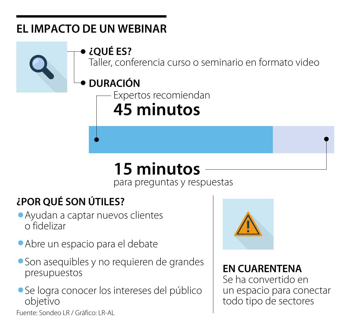 Los expertos recomiendan que los webinars deben durar máximo 45 minutos y tener 15 minutos de preguntas realizadas por los asistentes. El objetivo de esta herramienta es ayudar a capturar o fidelizar clientes, además de brindar un espacio para el debate y la confrontación de opiniones. El beneficio tanto para empresas como usuarios es que son asequibles y no requieren de grandes presupuestos. Por ejemplo, los medios de comunicación han implementado esta herramienta para informar en esta coyuntura. Al citar expertos de varios sectores y un periodista como moderador, se tocan varios temas interesantes para la audiencia.