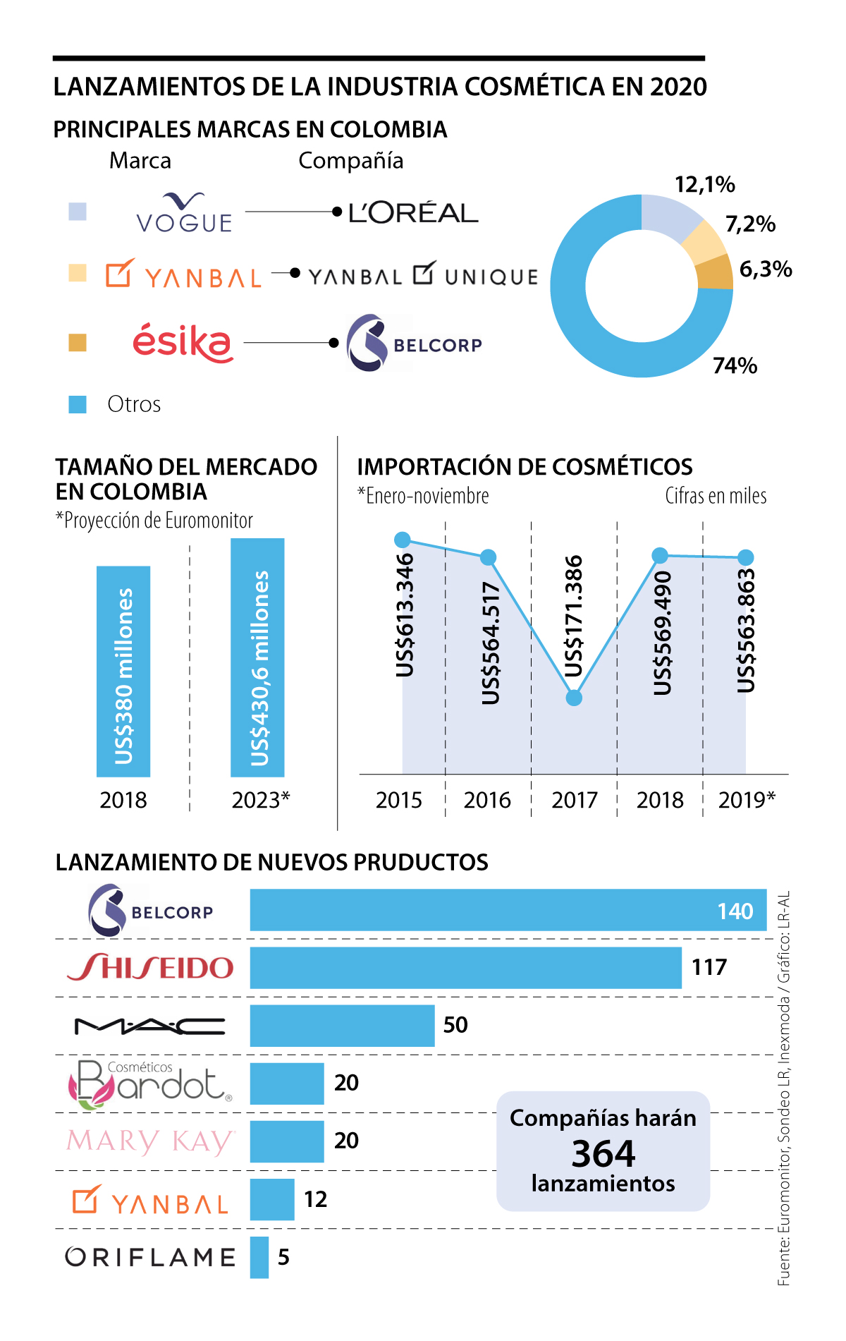 La mujer colombiana consume en promedio $300.000 trimestralmente en productos de maquillaje y cosméticos. En este mercado, que en 2018 movió US$380 millones en Colombia, y alcanzará US$430,6 millones a 2023, según cálculos de Euromonitor, algunas de las principales compañías y marcas ya han empezado a lanzar sus nuevos productos para 2020, lo que suma, por lo menos, 364 novedades.
