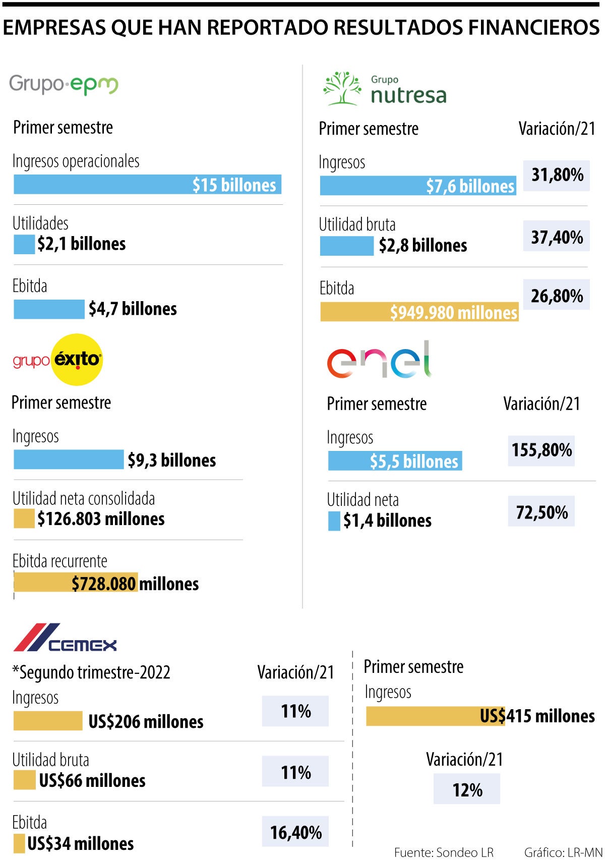 Grupo EPM , Grupo Éxito y Enel totalizaron $29,8 billones de ingresos consolidados en el primer semestre de operación en 2022, según lo deja ver el balance reportado entre enero y junio de este año. De acuerdo con este balance, Grupo EPM lidera el ranking de las empresas que han reportado hasta ahora, con ingresos de $15 billones y un Ebitda de $4,7 Billones, así como una utilidad de $2,1 billones.