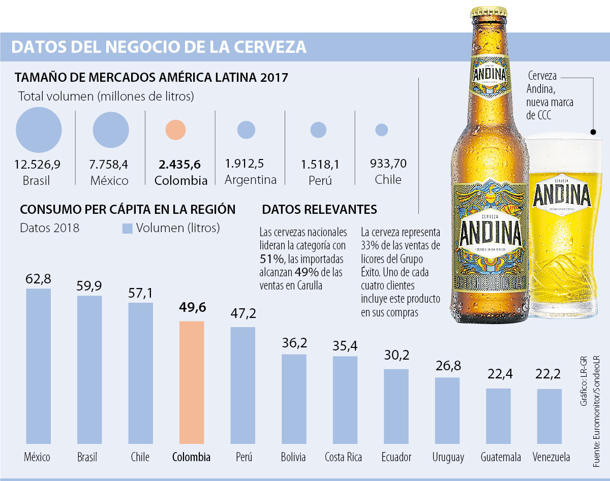 Andina, registro marcario que LR conoció que actualizó la Central Cervecera de Colombia en la Superintendencia de Industria y Comercio (SIC) en enero para identificar productos de la clase 32 (Cervezas y otros productos), entra a un negocio donde Bavaria concentra casi 97% de las ventas, que al año en el país llegan a $21,6 billones según Euromonitor; cifras que están por encima de países como Argentina y Chile; pero aún lejos de las ventas de Brasil y México. (Ver gráfico)