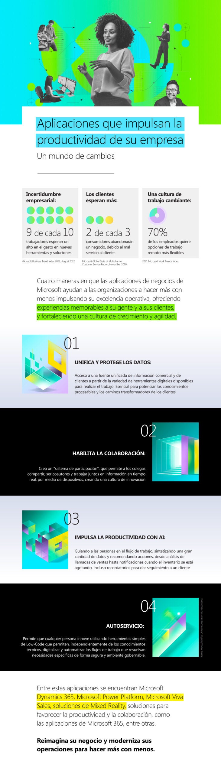 Para suplir esa necesidad, Microsoft tiene a su disposición un conjunto de aplicaciones para negocios de cualquier tipo e industria con el cual busca ayudarles a optimizar sus procesos y ofrecer entornos laborales más ágiles y flexibles, que atiendan las nuevas dinámicas de los mercados y estén acordes con las expectativas tanto de sus clientes y consumidores, como de sus colaboradores.