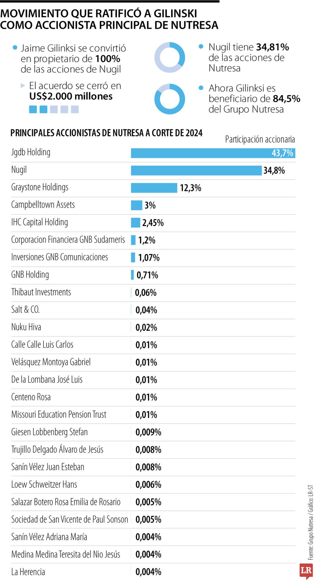 Para el cierre del acuerdo, organizaciones relacionadas con Gilinski gestionaron US$2.000 millones, y como Nugil tiene 34,81% de las acciones de Nutresa, Gilinski se consolidó como el mayor beneficiario de las acciones del Grupo con 84,5%.