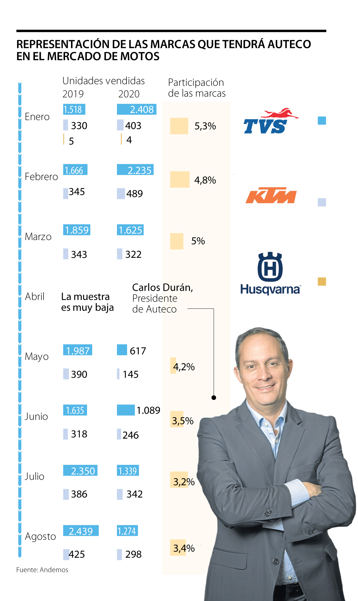 Estamos satisfechos porque a partir de septiembre hemos firmado una alianza con TVS, una de la empresas con 120 años en la industria, presencia en 60 países, uno de los cinco jugadores principales del mercado, y que ofrece a Colombia un portafolio totalmente renovado, apalancado en innovación y calidad, con el que podremos ofrecer a nuestros clientes no solo productos de motos de calle, también motos eléctricas, scooters, motos automáticas y semiautomáticas; y motocarros, lo cual sin duda va a permitirnos que en enero de 2021 tengamos el mayor portafolio de la industria colombiana.