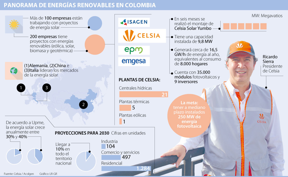 Cifras de la Unidad de Planeación Minero Energética (Upme) señalan que en este momento ya hay más de 200 proyectos empresariales inscritos ante la entidad. Sin embargo, aunque por ahora se están haciendo las subastas previas para su desarrollo, se espera que para antes de 2030 cerca de 10% del consumo en general provenga de esta energía. Esto de la mano de empresas como Isagen, EPM, Emgesa y Celsia que, entre otras cosas, ya le vienen apostando a las energías no convencionales.