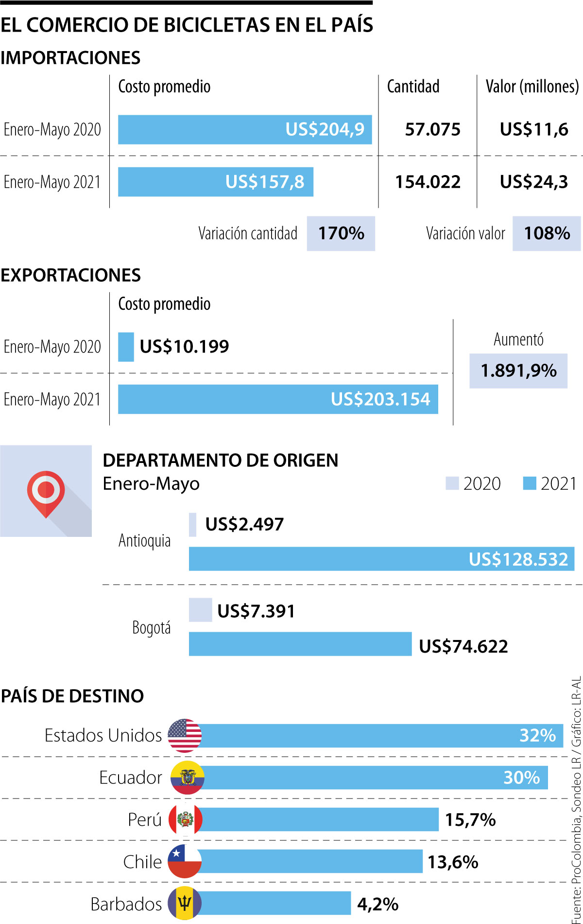 Con el nuevo mercado, las empresas locales han visto una oportunidad para la exportación, ProColombia registra que a mayo de 2021 la cifra llegó a US$203.154, es decir, 1.891% más versus 2020. Con lo que además de exportar ciclistas, el país podría empezar a ver un espacio para la venta de sus productos.