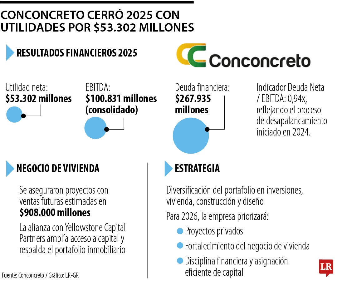Por medio de un comunicado, Conconcreto anunció que cerró 2025 con una utilidad neta de $53.302 millones y un Ebitda de $100.831 millones. Durante este año mantuvo un endeudamiento financiero estable ($267.935 millones) y un indicador de deuda neta/Ebitda de 0,94 x, debido al proceso de desapalancamiento ejecutado en 2024.