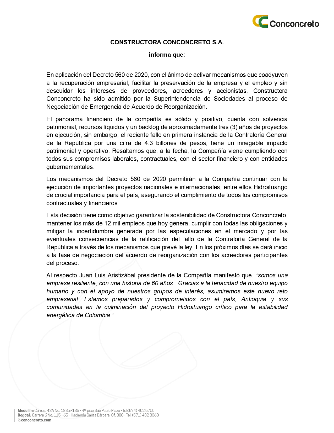 "En aplicación del Decreto 560 de 2020, con el ánimo de activar mecanismos que coadyuven a la recuperación empresarial, facilitar la preservación de la empresa y el empleo y sin descuidar los intereses de proveedores, acreedores y accionistas, Constructora Conconcreto ha sido admitido por la Superintendencia de Sociedades al proceso de Negociación de Emergencia de Acuerdo de Reorganización", indican en el comunicado.