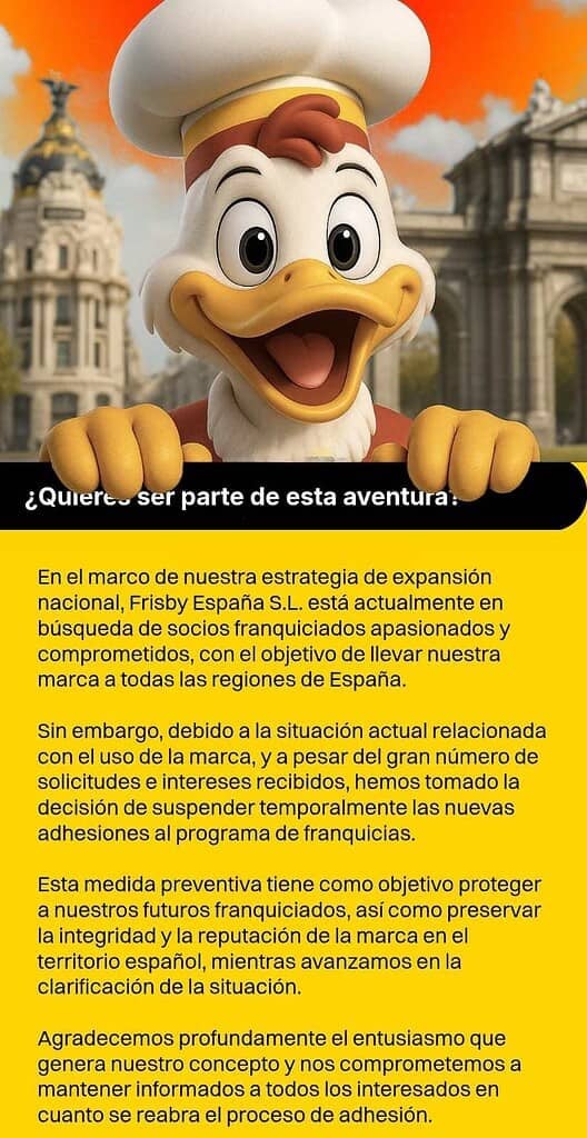 En un comunicado oficial, Frisby España afirmó que, “en el marco de nuestra estrategia de expansión nacional, Frisby España S.L. está actualmente en búsqueda de socios franquiciados apasionados y comprometidos, con el objetivo de llevar nuestra marca a todas las regiones de España.” Sin embargo, añadieron que “debido a la situación actual relacionada con el uso de la marca, y a pesar del gran número de solicitudes e intereses recibidos, hemos tomado la decisión de suspender temporalmente las nuevas adhesiones al programa de franquicias”.