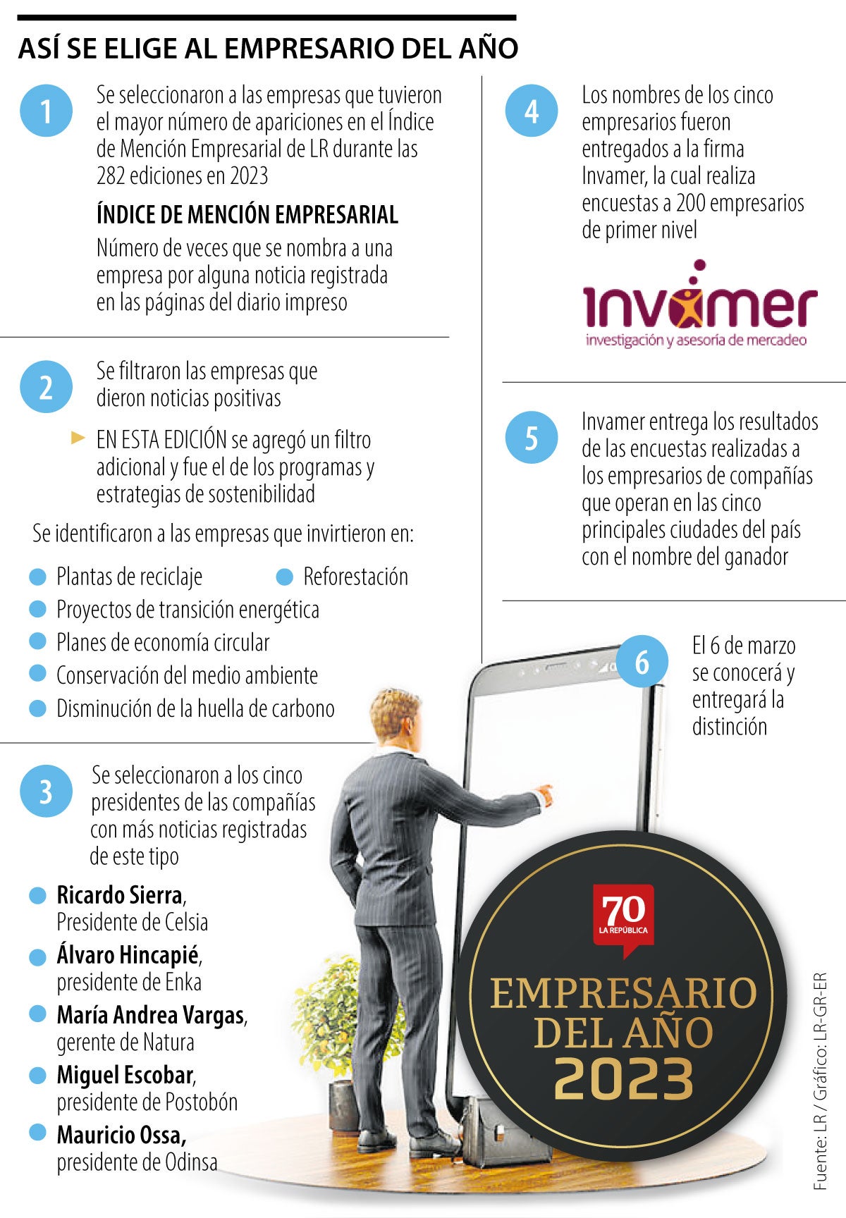 Desde hace dos décadas, La República realiza cada año un ejercicio de recopilación y análisis de las noticias anuales publicadas para elegir a los personajes. Los ítems que se tienen en cuenta son los logros obtenidos bajo su gerencia, resultados financieros positivos y su contribución a la sociedad.