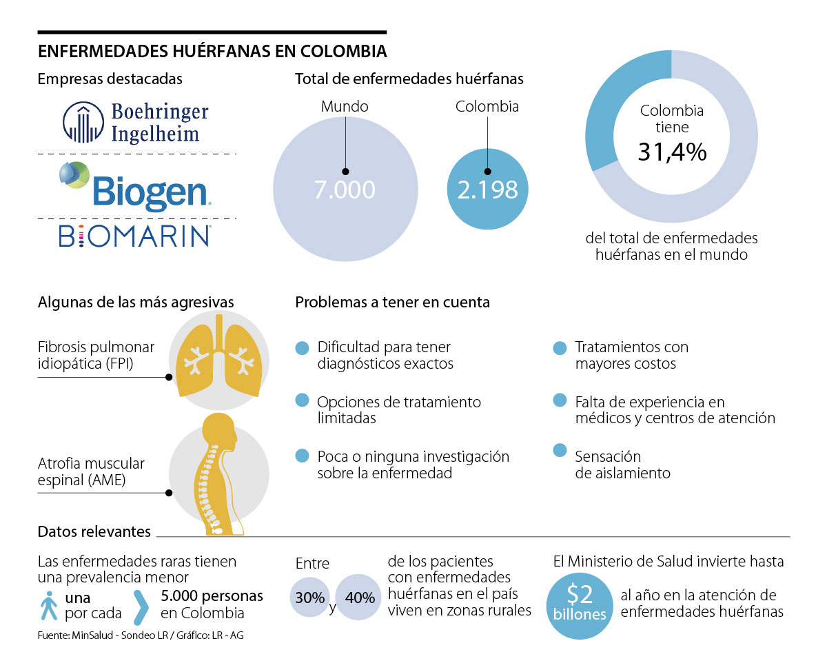 Al observar el panorama en Colombia, cabe destacar que la resolución emitida en diciembre de 2018 por el Ministerio de Salud registra 2.198 enfermedades huérfanas en el país de las 7.000 que existen en el mundo. Dicha cifra representa 31,4% del total. Para tratarlas, se destinan recursos entre $1,5 billones y $2 billones al año.