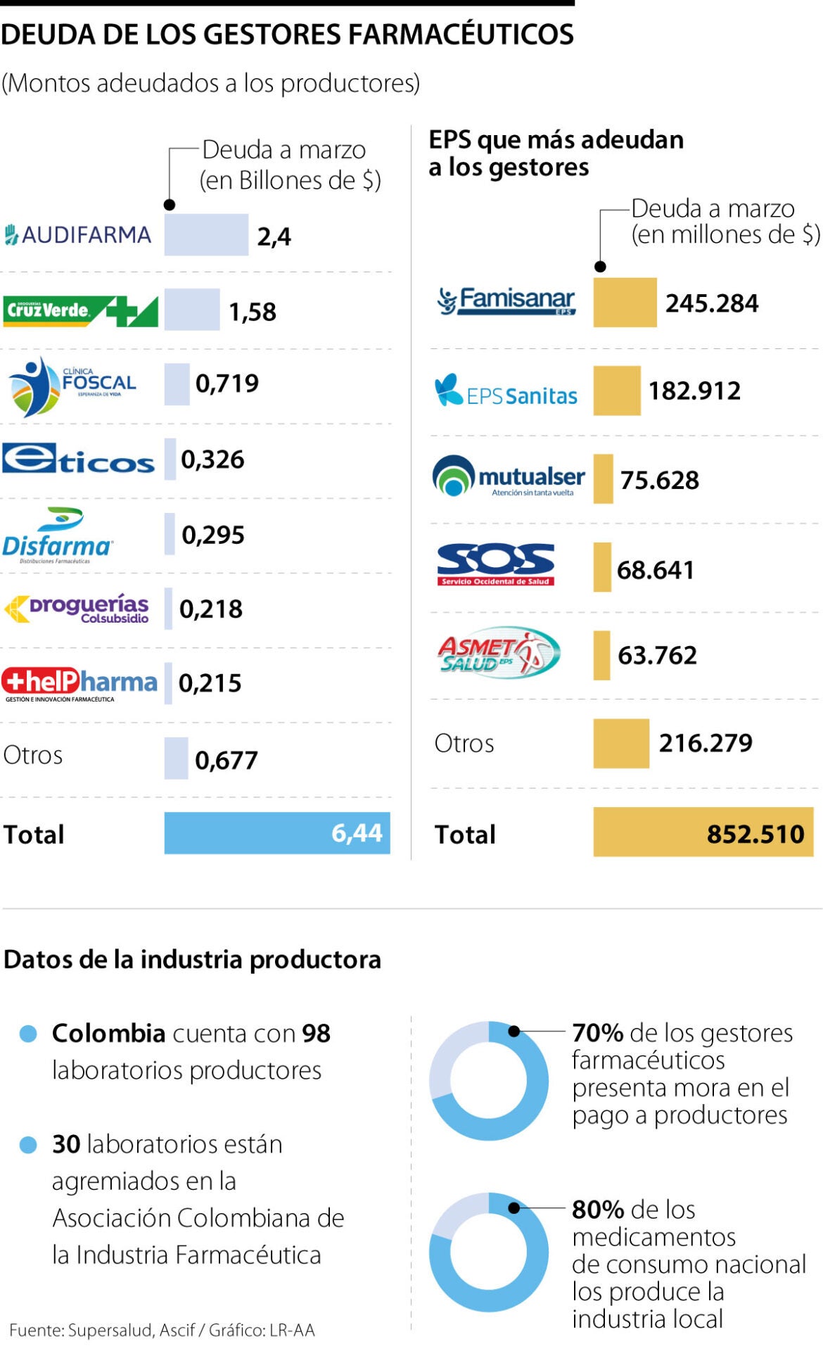 De acuerdo con la Superintendencia de Salud, con corte a marzo, a los laboratorios fabricantes las EPS les adeudaban más de $6 billones y, en muchos casos, esa cartera evidencia una morosidad que les afecta la caja, por lo que está por definirse qué tanto les impactaría el margen de rentabilidad esta iniciativa.