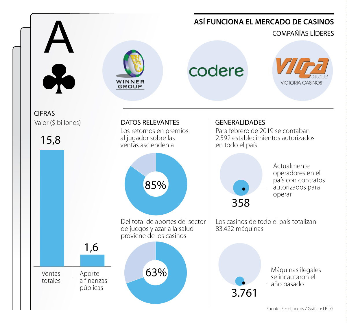 Según cifras de la Federación Colombiana de Empresarios de Juegos de Azar (Fecoljuegos), las ventas del mercado de juegos de azar en Colombia ascienden a $15,8 billones. A su vez, la agremiación destaca que el retorno en premios al jugador sobre las ventas asciende a 85%. En materia de aportes a las finanzas públicas del país, que comprenden IVA y derechos de explotación transferidos a la salud de los colombianos, la cifra actualmente asciende a $1,6 billones. En la actualidad hay 2.592 establecimientos operando en el país y 358 operadores con contratos autorizados para prestar este servicio.