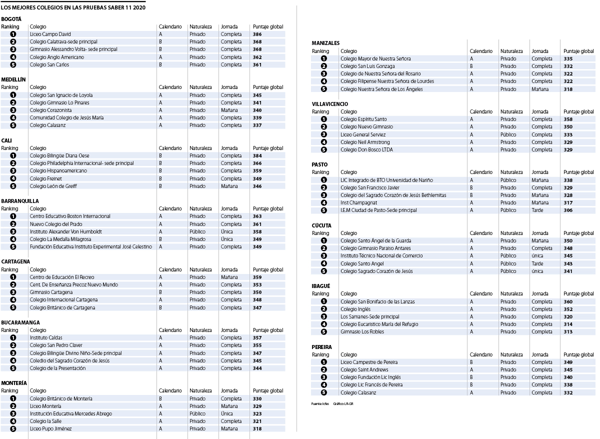 Teniendo en cuenta los resultados agregados de las pruebas Saber 11-2020, LR elaboró un listado para presentar a los mejores colegios de 13 ciudades del país.