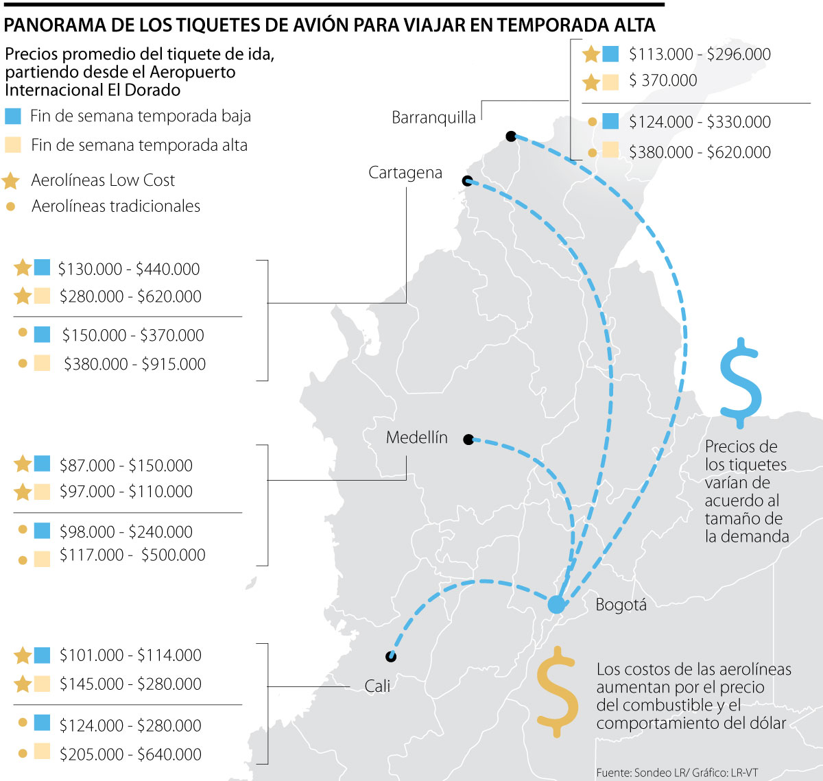 Ante este panorama, LR realizó un sondeo en el valor de los tiquetes aéreos para conocer cómo varían los precios desde Bogotá hacia Cali, Medellín, Barranquilla y Cartagena, en temporada alta y baja.