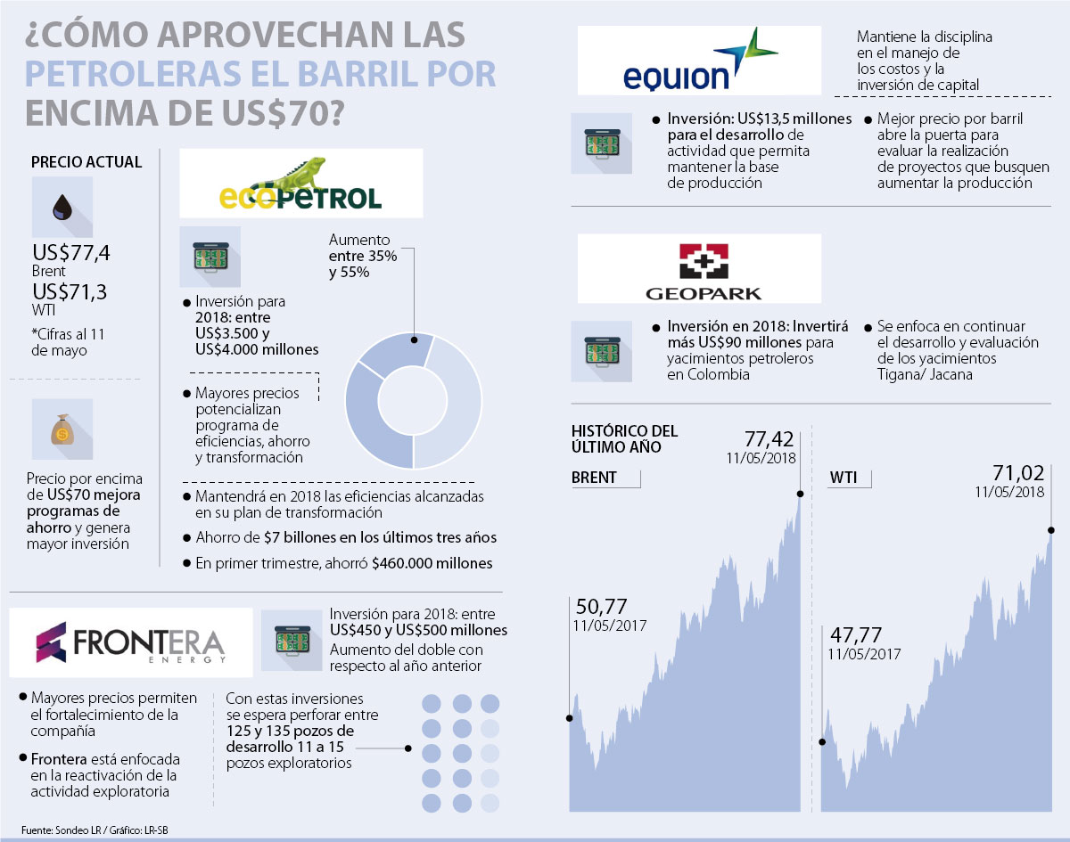 Otra de las petroleras que ve con buenos ojos el barril de petróleo a US$70 es Frontera Energy, antes Pacific E&P. La compañía indicó que por ahora está enfocada en la reactivación de la actividad exploratoria donde hace presencia. De hecho, aclaró que este año realizará inversiones cercanas a US$450 millones y US$500 millones, lo que significa que duplicó la cifra frente al año anterior.