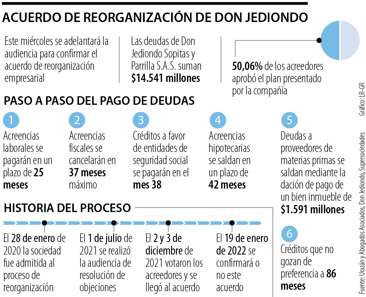 Hoy miércoles se llevará a cabo la audiencia de confirmación del acuerdo de reorganización de Don Jediondo Sopitas y Parrilla S.A.S., el cual ya fue aprobado por 50,06% de los acreedores, según informó Juan Carlos Urazán Aramendiz, socio de Urazán & Abogados Asociados, firma experta en insolvencia empresarial.