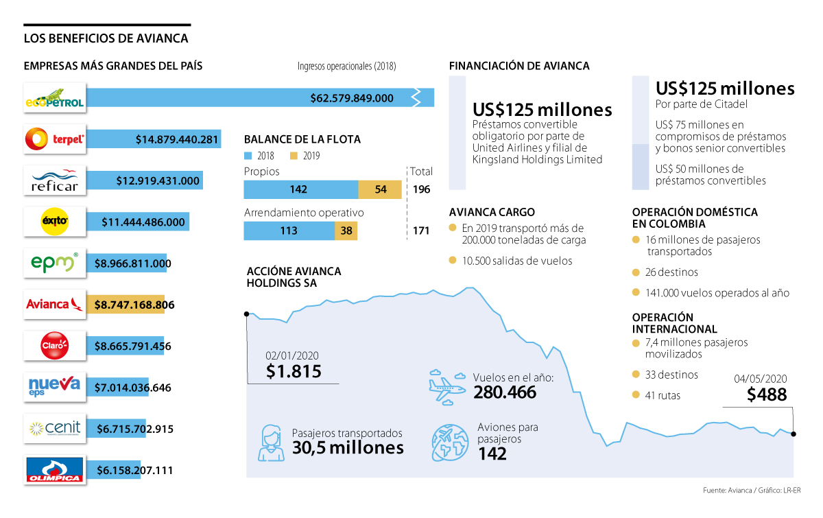 La operación de Avianca movilizó 50,05% de pasajeros nacionales y 42,82% de los internacionales. En 2019, transportó 30,5 millones de pasajeros en total; 16 millones en el mercado local. Entre tanto, las cuatro aerolíneas siguientes logran 47% de participación en el mercado local. Para el economista Jorge Antonio Ocampo, el Gobierno debe apostar por ayudar a empresas “sistémicamente importantes”, en las que se incluyen las empresas que ofrecen servicios públicos como lo son Avianca y las aerolíneas. Para apoyarla, se puede hacer por créditos, una emisión de bonos respaldada por el Estado o capitalizarla.
