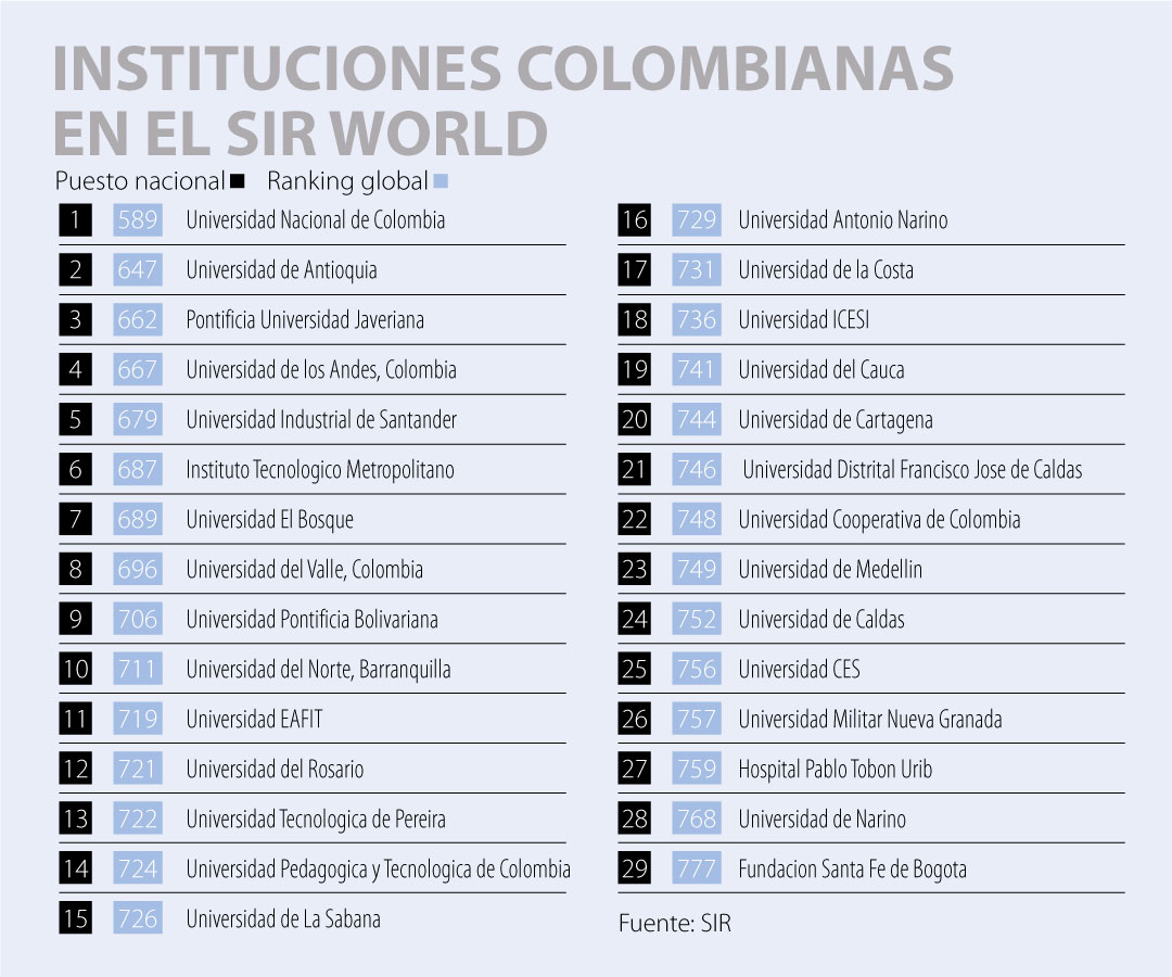 Exactamente 27 universidades colombianas lograron posicionarse en el SCImago Institutions Ranking (SIR 2018), una clasificación de las Instituciones de Educación Superior con base en tres factores de medición (Investigación, Innovación e Impacto Social).