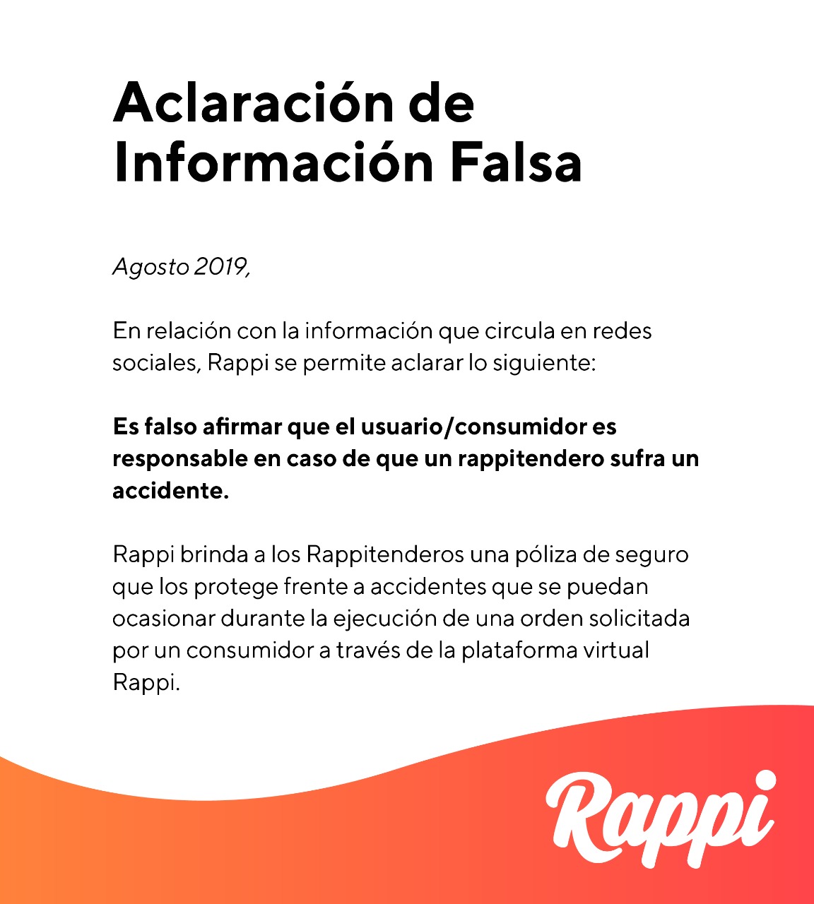 Rappi explicó mediante un comunicado que circula en redes sociales sobre la responsabilidad que tienen los consumidores o usuarios de la aplicación con los rappitenderos es falsa.