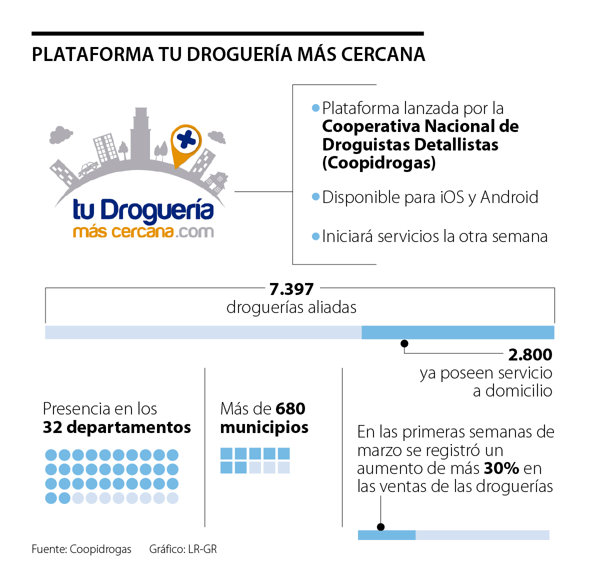 Con la emergencia sanitaria, Coopidrogras inició un proceso de actualización de datos y georeferenciación para todas las droguerías que están manejando domicilios, en los más de 680 municipios en los que la cooperativa registra afiliados, dado que varias han optado por instaurar estos servicios en base a que las operaciones de venta presencial se han ido restringiendo.